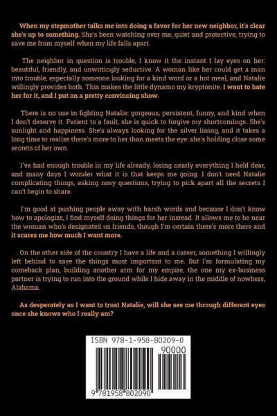 When my stepmother talks me into doing a favor for her new neighbor, it's clear she's up to something. She's been watching over me for years, quiet and protective, trying to save me from myself each time my life falls apart. The neighbor in question is trouble, I know it the instant I lay eyes on her: she's beautiful, friendly, and unwittingly seductive. A woman like her could get a man into deep trouble, especially someone looking for a kind word or a hot meal, and Natalie willingly provides both. For someone who's been starved for human affection and home cooked meals for years, this makes the little dynamo my kryptonite. I want to hate her for it, and I put on a pretty convincing show. There is no use in fighting Natalie: gorgeous, persistent, funny, and kind when I don't deserve it. Patient to a fault, she is quick to forgive my shortcomings. She's sunlight and happiness. Feisty and wonderful. She's always looking for the silver lining, and it takes a long time to realize there's more to her than meets the eye: she's holding some secrets of her own and holding them close. I've had enough trouble in my life already, losing nearly everything I held dear, and many days I wonder what it is that keeps me going. I don't need Natalie complicating things, asking nosy questions, trying to pick apart all the secrets I can't begin to share. I'm good at pushing people away with harsh words and because I don't know how to apologize, I find myself doing things for her instead. It allows me to be near the woman who's designated us friends, though I'm certain there's more there. It scares me how much I want more. When a project spirals out of control and I have to call in help, I begin to understand just what I stand to lose when I see her through the eyes of someone more desirable than me. Yet I continue to dig myself deeper... On the other side of the country I have a life and a career, something I willingly left behind to save the things most important to me. But I'm formulating my comeback plan, building another arm for my empire, the one my ex-business partner is trying to run into the ground while I hide away in the middle of nowhere, Alabama. As desperately as I want to trust Natalie, will she see me through different eyes once she knows who I really am?