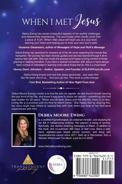 Debra Moore Ewing's motto is to live life with no regrets. As she found herself nearing the last third of her life, she knew it was time to share her secret--something she had kept hidden for 52 years. "When you've seen Jesus and the afterlife, there is no fear. Living life is a process until it's time to return home." She hopes that by sharing this, her story might help others to replace fear with faith when you hear of her first-hand experiences with Him.