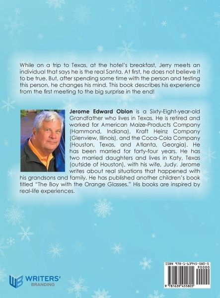 While on a trip to Texas, at the hotel's breakfast, Jerry meets an individual that says he is the real Santa. At first, he does not believe it to be true. But, after spending some time with the person and testing this person, he changes his mind. This book describes his experience from the first meeting to the big surprise in the end! Jerome Edward Oblon is a Sixty-Eight-year-old Grandfather who lives in Texas. He is retired and worked for American Maize-Products Company (Hammond, Indiana), Kraft Heinz Company (Glenview, Illinois), and the Coca-Cola Company (Houston, Texas, and Atlanta, Georgia). He has been married for forty-four years. He has two married daughters and lives in Katy, Texas (outside of Houston), with his wife, Judy. Jerome writes about real situations that happened with his grandsons and family. He has published another children's book titled "The Boy with the Orange Glasses." His books are inspired by real-life experiences.