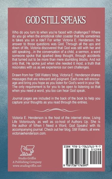 Who do you turn to when you're faced with challenges? Where do you go when the emotional roller coaster that life sometimes is takes you on a ride? For writer Victoria Henderson Poole, the answer to those questions was God. Through all the ups and down of life, Victoria discovered that God was still with her and still speaking...in the conversation of a child, a sermon, a word someone spoke that sparked deep thought, through accidents that turned out to be more than mere stumbling blocks. And not only that, He spoke just when she needed it most, a truth that resonates with us as we experience our own challenges. Drawn from her 'Still Waters' blog, Victoria Henderson Poole shares messages that are relevant and poignant. Each one will encourage and bring you hope as you listen for God's word in your life. The only requirement is for you to be open to listening so that when you need a word, you too can hear God speak.