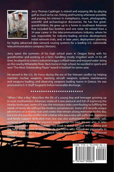 "When I Was a Boy" describes the life of a young boy and teenager growing up in rural southwestern Arkansas; some of it was pastural and full of exploring the nearby landscape, and some of it was the necessary tasks contributing to fulfilling the needs of family life without the modern conveniences. Some of it records unique adventures on a nearby river and creeks that remain strong memories to this day, but a lot of it was the conflict with a father who was a very self-sufficient, ingenious, and family support dedicated man but was also authoritarian, completely self-centered and unfeeling for anyone's needs except his own. He was also, in later years, treated for mental instability. This book is about survival in that home and the help and support of someone outside the house who helped me personally redefine who I was. I hope this book helps those who may have experienced similar circumstances.