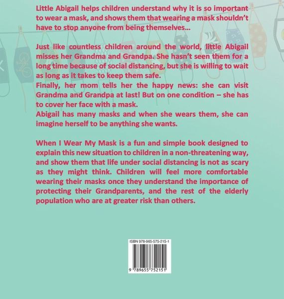 Little Abigail helps children understand why it is so important to wear a mask, and shows them that wearing a mask shouldn't have to stop anyone from being themselves... Just like countless children around the world, little Abigail misses her Grandma and Grandpa. She hasn't seen them for a long time because of social distancing, but she is willing to wait as long as it takes to keep them safe. Finally, her mom tells her the happy news: she can visit Grandma and Grandpa at last! But on one condition - she has to cover her face with a mask. Abigail has many masks and when she wears them, she can imagine herself to be anything she wants. In these unusual and uncertain times, children face many unfamiliar challenges. It is the parents' job to give them as much support as possible. When I Wear My Mask is a fun and simple book designed to explain this new situation to children in a non-threatening way, and show them that life under social distancing is not as scary as they might think. Children will feel more comfortable wearing their masks once they understand the importance of protecting their Grandparents, and the rest of the elderly population who are at greater risk than others.