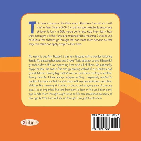 This book is based on the Bible verse What time I am afraid, I will trust in thee (Psalm 56:3). I wrote this book to not only encourage children to learn a Bible verse but to also help them learn how they can apply it to their lives and understand its meaning. I tried to use situations that children go through that can make them nervous so that they can relate and apply prayer to their lives.