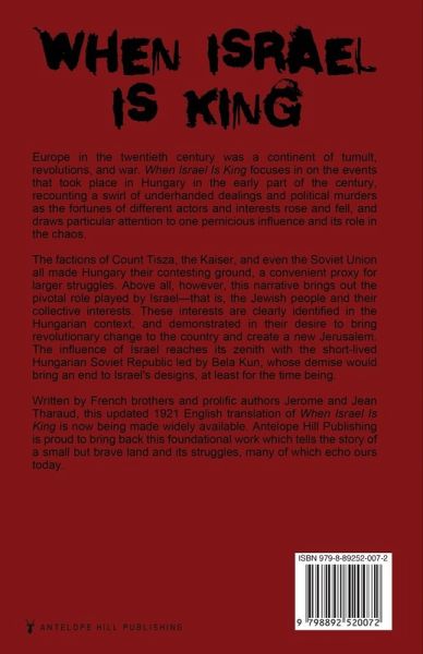 Europe in the twentieth century was a continent of tumult, revolutions, and war. When Israel Is King focuses in on the events that took place in Hungary in the early part of the century, recounting a swirl of underhanded dealings and political murders as the fortunes of different actors and interests rose and fell, and draws particular attention to one pernicious influence and its role in the chaos. The factions of Count Tisza, the Kaiser, and even the Soviet Union all made Hungary their contesting ground, a convenient proxy for larger struggles. Above all, however, this narrative brings out the pivotal role played by Israel-that is, the Jewish people and their collective interests. These interests are clearly identified in the Hungarian context, and demonstrated in their desire to bring revolutionary change to the country and create a new Jerusalem. The influence of Israel reaches its zenith with the short-lived Hungarian Soviet Republic led by Bela Kun, whose demise would bring an end to Israel's designs, at least for the time being. Written by French brothers and prolific authors Jerome and Jean Tharaud, this updated 1921 English translation of When Israel Is King is now being made widely available. Antelope Hill Publishing is proud to bring back this foundational work which tells the story of a small but brave land and its struggles, many of which echo ours today.