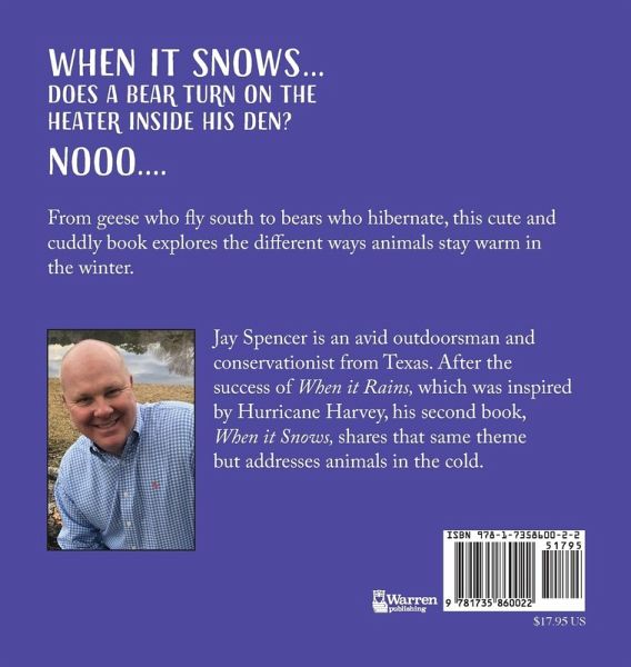 Jay Spencer is an avid outdoorsman and conservationist. After the success of When it Rains which was inspired by Hurricane Harvey, his second book When it Snows shares the same theme but addresses animals in the cold.