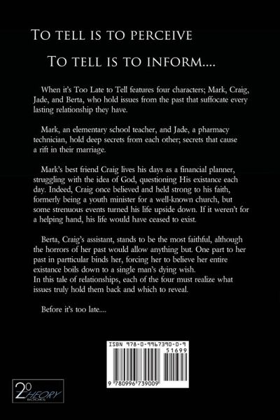 To tell is to perceive. To tell is to inform. When it's Too Late to Tell features four characters, Mark, Craig, Jade and Berta, all holding issues from the past that suffocate every lasting relationship they have. Mark, an elementary school teacher, and his wife Jade, a pharmacy technician, hold deep secrets from each other; secrets that cause a rift in their marriage. Mark's best friend Craig lives his days as a financial planner, struggling with the idea of God, questioning His existence each day. Indeed, Craig once believed and held strong to his faith, formerly being a youth minister for a well-known church, but some strenuous events turned his life upside down. If it weren't for a helping hand, his life would have ceased to exist. Berta, Craig's assistant, stands to be the most faithful, although the horrors that happened to her in her past would allow anything but. One part to her past in particular binds her, forcing her to believe that her entire existence boils down to a single man's dying wish. In this mesmeric story of relationships, each of the four must realize what issues truly hold them back and what issues to reveal before it is too late.