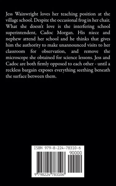 Jess Wainwright loves her teaching position at the village school. Despite the occasional frog in her chair. What she doesn't love is the interfering school superintendent, Cadoc Morgan. His niece and nephew attend her school and he thinks that gives him the authority to make unannounced visits to her classroom for observation, and remove the microscope she obtained for science lessons. Jess and Cadoc are both firmly opposed to each other - until a reckless bargain exposes everything seething beneath the surface between them.