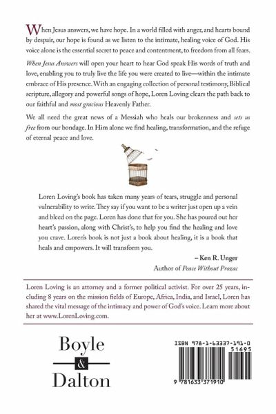 When Jesus answers, we have hope. In a world filled with anger, and hearts bound by despair, our hope is found as we listen to the intimate, healing voice of God. His voice alone is the essential secret to peace and contentment, to freedom from all fears. When Jesus Answers will open your heart to hear God speak His words of truth and love, enabling you to truly live the life you were created to live—within the intimate embrace of His presence. With an engaging collection of personal testimony, Biblical scripture, allegory and powerful songs of hope, Loren Loving clears the path back to our faithful and most gracious Heavenly Father. We all need the great news of a Messiah who heals our brokenness and sets us free from our bondage. In Him alone we find healing, transformation, and the refuge of eternal peace and love.