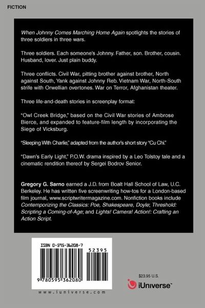 When Johnny Comes Marching Home Again spotlights the stories of three soldiers in three wars. Three soldiers. Each someone's Johnny. Father, son. Brother, cousin. Husband, lover. Just plain buddy. Three conflicts. Civil War, pitting brother against brother, North against South, Yank against Johnny Reb. Vietnam War, North-South strife with Orwellian overtones. War on Terror, Afghanistan theater. Three life-and-death stories in screenplay format: 'Owl Creek Bridge," based on the Civil War stories of Ambrose Bierce, and expanded to feature-film length by incorporating the Siege of Vicksburg. 'Sleeping With Charlie," adapted from the author's short story 'Cu Chi." 'Dawn's Early Light," P.O.W. drama inspired by a Leo Tolstoy tale and a cinematic rendition thereof by Sergei Bodrov Senior.
