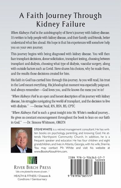 A Faith Journey Through Kidney Failure When Kidneys Fail is the autobiography of Steve's journey with kidney disease. It's written to help people with kidney disease, and their family and friends, better understand what lies ahead. His hope is that his experiences will somehow help you on your own journey. This journey begins with being diagnosed with kidney disease. You will then face transplant decisions, donor solicitation, transplant testing, choosing between transplant and dialysis, choosing what type of dialysis, vascular surgery, along with outside factors such as Covid. Steve shares his choices, why he made them, and the results those decisions created for him. His faith in God has carried him through this journey. As you will read, his trust in the Lord meant everything. His Jehoshaphat moment was especially poignant. And always remember-God loves you, and He knows the mess you're in! "When Kidneys Fail is an open and honest description of his journey with kidney disease, his struggles navigating the world of transplant, and the decision to live with dialysis." -Denise Neal, RN, BSN, BS, CPTC "When Kidneys Fail is such a great insight into Mr. White's medical journey... He gives us constant encouragement throughout the book to lean on our faith in God." -Dr. Simone Whitmore, OBGYN