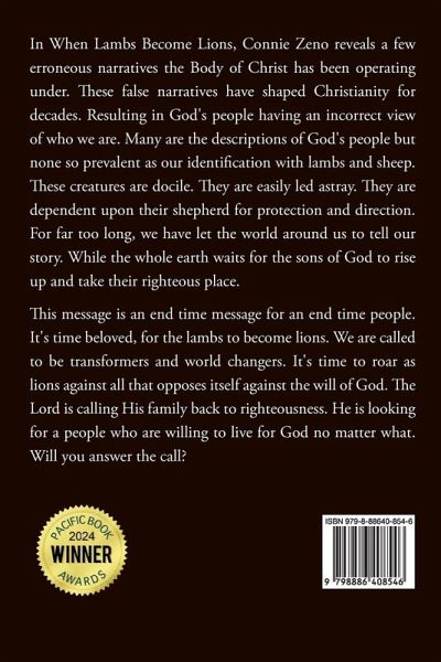 In When Lambs Become Lions, Connie Zeno reveals a few erroneous narratives the Body of Christ has been operating under. These false narratives have shaped Christianity for decades. Resulting in God's people having an incorrect view of who we are. Many are the descriptions of God's people but none so prevalent as our identification with lambs and sheep. These creatures are docile. They are easily led astray. They are dependent upon their shepherd for protection and direction. For far too long, we have let the world around us to tell our story. While the whole earth waits for the sons of God to rise up and take their righteous place. This message is an end time message for an end time people. It's time beloved, for the lambs to become lions. We are called to be transformers and world changers. It's time to roar as lions against all that opposes itself against the will of God. The Lord is calling His family back to righteousness. He is looking for a people who are willing to live for God no matter what. Will you answer the call?