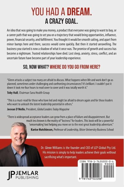 WHEN LEADERS ARE LOST Moving Beyond Disappointment, Failure, and Hurt to Redefine Success You had a dream. A crazy goal. An idea that was going to make you money, a product that everyone was going to want to buy, or a career path that was going to set you on a trajectory that would bring opportunities, influence, power, financial security, and fulfillment. You thought it would be smooth sailing, and apart from minor bumps here and there, success would come quickly. But then it started unravelling. The business you started is now a shadow of what it once was. The promise of growth and success has become a nightmare. Trusted relationships have died. Lost sleep, anxiety, stress, conflict, and an uncertain future have become part of your leadership experience. So, now what? Where do you go from here? "Glenn attacks a subject too many are afraid to discuss. What happens when life and work don't go as planned, sometimes under challenging and confronting circumstances? It's brilliant. I couldn't put it down it took me four hours to read cover to cover and it was totally worth it." "This is a must-read for those who have led and might be afraid to dream again and for those leaders who want to unleash the latent leadership potential in others." "There is widespread acceptance leaders can grow from a place of failure and disappointment. But much less known is the reality of "lostness" for leaders. This book will be a powerful 'sensemaking' tool helping you move on to the next great leadership adventure."