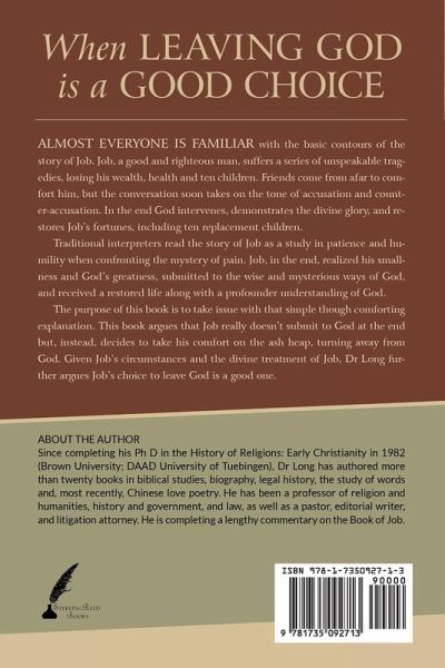 Almost everyone is familiar with the basic contours of the story of Job. Job, a good and righteous man, suffers a series of unspeakable tragedies, losing his wealth, health and ten children. Friends come from afar to comfort him, but the conversation soon takes on the tone of accusation and counter-accusation. In the end God intervenes, demonstrates the divine glory, and restores Job's fortunes, including ten replacement children. Traditional interpreters read the story of Job as a study in patience and humility when confronting the mystery of pain. Job, in the end, realized his smallness and God's greatness, submitted to the wise and mysterious ways of God, and received a restored life along with a profounder understanding of God. The purpose of this book is to take issue with that simple though comforting explanation. This book argues that Job really doesn't submit to God at the end but, instead, decides to take his comfort on the ash heap, turning away from God. Given Job's circumstances and the divine treatment of Job, Dr Long further argues Job's choice to leave God is a good one.