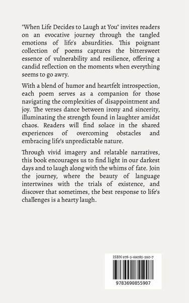"When Life Decides to Laugh at You" invites readers on an evocative journey through the tangled emotions of life's absurdities. This poignant collection of poems captures the bittersweet essence of vulnerability and resilience, offering a candid reflection on the moments when everything seems to go awry. With a blend of humor and heartfelt introspection, each poem serves as a companion for those navigating the complexities of disappointment and joy. The verses dance between irony and sincerity, illuminating the strength found in laughter amidst chaos. Readers will find solace in the shared experiences of overcoming obstacles and embracing life's unpredictable nature. Through vivid imagery and relatable narratives, this book encourages us to find light in our darkest days and to laugh along with the whims of fate. Join the journey, where the beauty of language intertwines with the trials of existence, and discover that sometimes, the best response to life's challenges is a hearty laugh.