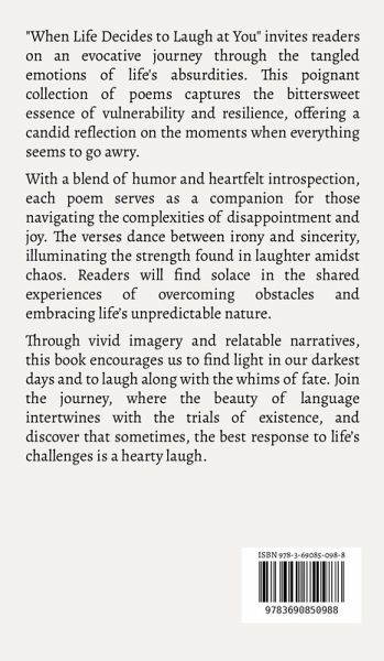 "When Life Decides to Laugh at You" invites readers on an evocative journey through the tangled emotions of life's absurdities. This poignant collection of poems captures the bittersweet essence of vulnerability and resilience, offering a candid reflection on the moments when everything seems to go awry. With a blend of humor and heartfelt introspection, each poem serves as a companion for those navigating the complexities of disappointment and joy. The verses dance between irony and sincerity, illuminating the strength found in laughter amidst chaos. Readers will find solace in the shared experiences of overcoming obstacles and embracing life's unpredictable nature. Through vivid imagery and relatable narratives, this book encourages us to find light in our darkest days and to laugh along with the whims of fate. Join the journey, where the beauty of language intertwines with the trials of existence, and discover that sometimes, the best response to life's challenges is a hearty laugh.