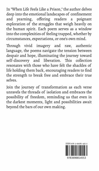 In "When Life Feels Like a Prison," the author delves deep into the emotional landscapes of confinement and yearning, offering readers a poignant exploration of the struggles that weigh heavily on the human spirit. Each poem serves as a window into the complexities of feeling trapped, whether by circumstances, expectations, or one's own mind. Through vivid imagery and raw, authentic language, the poems navigate the tension between despair and hope, illuminating the journey toward self-discovery and liberation. This collection resonates with those who have felt the shackles of life holding them back, encouraging readers to find the strength to break free and embrace their true selves. Join the journey of transformation as each verse unravels the threads of isolation and embraces the possibility of freedom, reminding us that even in the darkest moments, light and possibilities await beyond the bars of our own making.