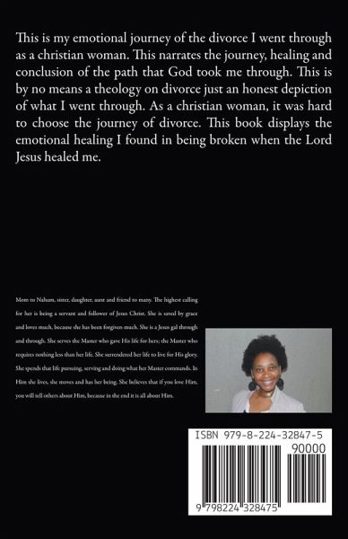This is my emotional journey of the divorce I went through as a christian woman. This narrates the journey, healing and conclusion of the path that God took me through. This is by no means a theology on divorce just an honest depiction of what I went through. As a christian woman, it was hard to choose the journey of divorce. This book displays the emotional healing I found in being broken when the Lord Jesus healed me.
