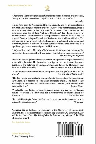 Nechama Tec's incisive account of the rescue of Jews by Christians in Nazi-occupied Poland draws heavily on her own childhood experiences. Her in-depth study - the first of its kind - contrasts the attitudes and behaviour of altruistic helpers, and paid rescuers. She discovers a fascinating pattern, in which altruistic Christians applied their customary practise of helping the needy, without regard for their own safety, whereas paid rescuers acted with the motive of removing the Jews and the danger they represented to Poland. This is a deeply affecting book, which deals squarely with the ingrained anti-Semitism in Polish society, yet pays tribute to the extraordinary risks taken by Polish people on behalf of their Jewish compatriots.