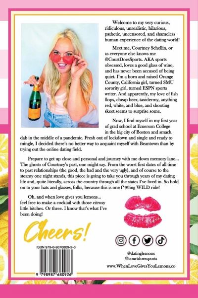 Welcome to my very curious, ridiculous, unrealistic, hilarious, pathetic, uncensored, and shameless human experience of the dating world! Meet me, Courtney Schellin, or as everyone else knows me @CourtDoesSports. AKA sports obsessed, loves a good glass of wine, and has never been accused of being quiet. I'm a born and raised Orange County, California girl, turned SMU sorority girl, turned ESPN sports writer. And apparently, my love of fish flops, cheap beer, taxidermy, anything red, white, and blue, and shooting skeet seems to surprise some. ¿¿¿ Now, I find myself in my first year of grad school at Emerson College in the big city of Boston and smack dab in the middle of a pandemic. Fresh out of lockdown and single and ready to mingle, I decided there's no better way to acquaint myself with Beantown than by trying out the online dating field. Prepare to get up close and personal and journey with me down memory lane... The ghosts of Courtney's past, one might say. From the worst first dates of all time to past relationships (the good, the bad and the very ugly), and of course to the steamy one night stands, this piece is going to take you through years of my dating life and, quite literally, across the country through all the states I've lived in. So hold on to your hats and glasses, folks, because this is one f*%!ing WILD ride! Oh, and when love gives you lemons... feel free to make a cocktail with those citrusy little bitches. Or three. I know that's what I've been doing!