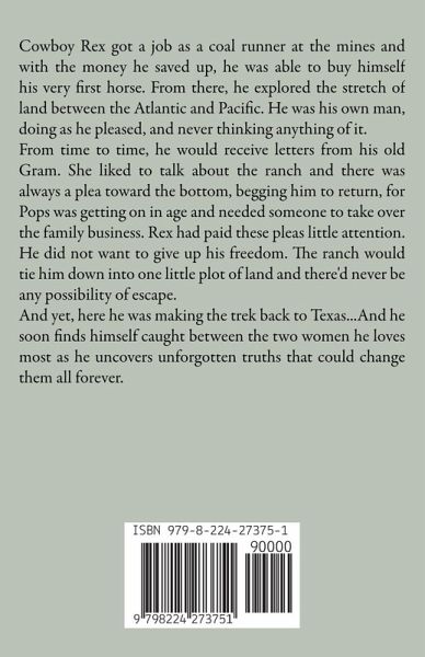 Cowboy Rex got a job as a coal runner at the mines and with the money he saved up, he was able to buy himself his very first horse. From there, he explored the stretch of land between the Atlantic and Pacific. He was his own man, doing as he pleased, and never thinking anything of it. From time to time, he would receive letters from his old Gram. She liked to talk about the ranch and there was always a plea toward the bottom, begging him to return, for Pops was getting on in age and needed someone to take over the family business. Rex had paid these pleas little attention. He did not want to give up his freedom. The ranch would tie him down into one little plot of land and there'd never be any possibility of escape. And yet, here he was making the trek back to Texas...And he soon finds himself caught between the two women he loves most as he uncovers unforgotten truths that could change them all forever.
