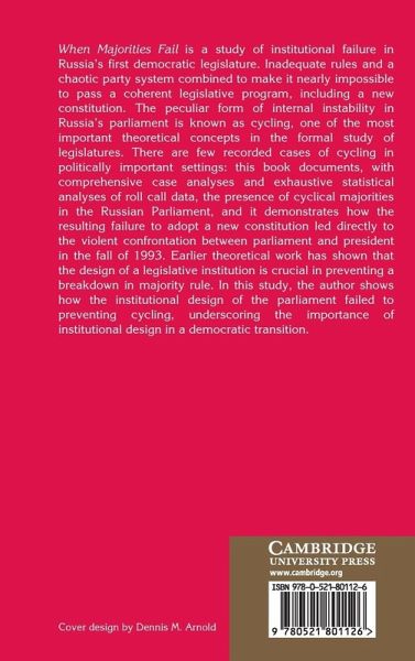 When Majorities Fail is a study of institutional failure in Russia's first democratic legislature. Inadequate rules and a chaotic party system combined to make it nearly impossible to pass a coherent legislative program, including a new constitution. The internal instability in Russia's parliament is known as cycling, one of the most important theoretical concepts in formal study of legislatures. There are few recorded cases of cycling in politically important settings. This book documents the presence of cyclical majorities in Russian Parliament with comprehensive case and statistical analysis, and demonstrates how the failure to adopt a new constitution led to the confrontation between parliament and president in the fall of 1993. Earlier research has shown that the design of a legislative institution is crucial in preventing cycling. The author shows how the institutional design of the parliament failed, underscoring the importance of institutional design in a democratic transition.