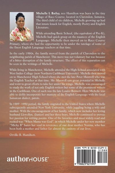 When Mama Was God: These are serious lyrics -Funny and Conscious, Riddim and Rhyme that have come from the pen of Michelle Bailey. She is one of those persons who sees cultural traditions as being evolutionary and should be passed from generation to generation not only orally but by the pen. She strongly believes that her cultural traditions and mores should not become extinct but should be valued and preserved as a result she has invested heavily in writing so that generation yet unborn along with the present generation can have a deeper appreciation of culture from an afro-centric perspective. In Michelle's seminal work, this book is not fluff. It is simply profound. The poems, properly read and understood show her academic depth and her grasp of the vernacular which she effectively weaves in her creations to tell her stories. Her use of rhetorical questions, similes and anthropomorphism do add color, create suspense and make the reader want to say yes, yes 'you right'. It points to issues relating to race, gender, religion, the Jamaican dialect and folk culture and Jamaicans' attitudes towards life and work, roots and culture. I also find this to be a potpourri of literary delight well-seasoned and well balanced and well served. I am opined it will have a cross sectional appeal to the target audience. Very appealing to me also were the poems : Somebody's Child, Ugly Truth, and If You Only Knew. Michelle is a true Jamaican cultural icon when you read her poems you develop nostalgia, and you are drawn right back to your roots. Read these serious lyrics, funny and conscious, riddim and rhyme, laugh till your belly 'bust', or cry till your gland runs out of tears, or bow your head in agreement till you develop your own literary riddim. Dr. Burnett L. Robinson Author, Pastor, Professor