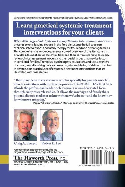 Leading experts reveal systemic and integrative approaches to family therapy When Marriages Fail: Systemic Family Therapy Interventions and Issues presents several leading experts in the field discussing the full spectrum of clinical interventions and family therapy for troubled and divorcing families. This comprehensive resource presents a broad overview of the literature that provides a foundation for the entire field, then narrows its focus to clearly review clinical assessment models and the special issues that may be factors in conflicted families. Therapists, psychologists, counselors, and social workers learn cutting-edge recommendations for policies protecting the well-being of children involved in divorce, plus practical, specific systemic treatment interventions that are illustrated with case studies. When Marriages Fail is separated into three logically organized sections. Part one provides a helpful overview of the field's evolving literature as it stands now and gives tools to therapists and their clients to explore their internal and dyadic processes in considering whether or not to divorce. The second part presents two systemic models that explore the dynamics of conflicted couples moving toward divorce and considers specific family circumstances that affect the entire divorce process, such as family violence, disclosure of gender orientation, and the unhappiness of the family's children. Part three discusses in detail specific and practical treatment interventions, considering factors involved when diverse families separate, divorce, and remarry. The text also provides a fitting tribute to William C. Nichols, a pioneer of marital and family therapy. Topics in When Marriages Fail include: the therapist's choices in helping couples process their own choices an ecosystemic look at the rights of children in divorce interventions for mourning, adulterous triangles, incongruent goals, cultural differences, or family of origin disclosing gay or lesbian orientation in marriage domestic violence issues children's trauma in the parental break-up family therapy interventions through three systemic stages of divorce remarriage of the first spouse in post-divorce families trauma of the betrayed spouse parent loss and serial relationships gay divorces and more! With Forewords by Douglas Sprenkle and Augustus Y. Napier as well as several international contributors who shed light on how this compelling subject is addressed outside of the United States, When Marriages Fail is an invaluable source of the latest knowledge and interventions for family therapists, counselors, social workers, and psychologists.