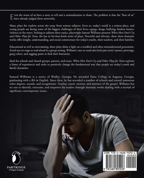Even the worst of us have a story to tell and a rationalization to share. The problem is that the "best of us" have already judged them unworthy. Many plays for student actors shy away from serious subjects. Even so, today's world is a serious place, and young people are facing some of the biggest challenges of their lives-gangs, drugs, bullying, broken homes, violence in the street. Seeking to address these topics, playwright Samuel Williams presents When Men Don't Cry and Other Plays for Teens, the last in his four-book series of plays. Powerful and relevant, these short dramatic works offer insight, understanding, and social commentary for today's youths, their teachers, and their families. Educational as well as entertaining, these plays shine a light on a troubled and often misunderstood generation. Acted out on stage or read aloud in a group setting, Williams' easy-to-read tales look past teens' tattoos, piercings, gang colors, and sagging pants to find their humanity. Ideal for schools and church groups, parents, and teens, When Men Don't Cry and Other Plays for Teens explores a litany of experiences and seeks to positively change the fundamental way that people see today's youth and family dynamics.