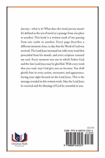 Journey--what is it? What does the word journey mean? It's defined as the act of travel or a passage from one place to another. This book is a written work of my passing from one realm to another. Every page describes a different moment, hour, or day that the Word of God was received. The Lord Jesus increased me with every word that proceeded from his mouth, and every scripture restored my soul. Every moment was one in which Father God and the Son Lord Jesus may be glorified. With every word that you read, may God give you an increase. You shall glorify him in every action, encounter, and appearance, having your sight focused on the Lord Jesus. This is the message revealed in this written work. May the Lord Jesus be received and the blessings of God be extended to you.