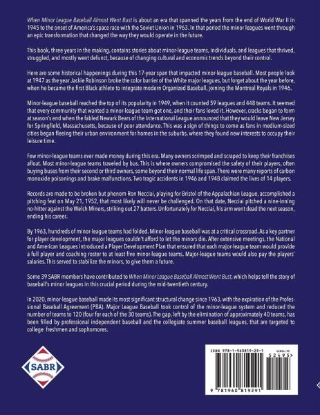 When Minor League Baseball Almost WentBust is about the epic transformation the minor leagues underwent from the end of World War II to the onset of America's space race with the Soviet Union. By 1949, the minors' boom would reach its peak, with 59 leagues and 448 teams, but their downfall was just around the corner. This book, three years in the making, with contributions from 39 SABR members, contains stories about minor-league teams, individuals, and leagues that thrived, struggled, and mostly went defunct, because of changing cultural and economic trends beyond their controlfrom 1946 through 1963. The fabled Newark Bears of the International League announced after the 1949 season that they would leave New Jersey for Springfield, Massachusetts, because of poor attendance. This was a sign of things to come as fans in medium-sized cities began fleeing to the suburbs. Few minor-league teams made money during this era. Most teams traveled by bus, and owners, scrimping and saving, compromised the safety of their players by buying buses from their second or third owners, some beyond their normal life span. There were many reports of carbon monoxide poisonings and brake malfunctions. Tragic accidents in 1946 and 1948 claimed the lives of 14 players. There were bright spots and historic feats, of course. Jackie Robinson would integrate an affiliated team for the first time when he played for the Montreal Royals in 1946. Phenom Ron Necciai, playing for Bristol of the Appalachian League, accomplished a pitching feat on May 21, 1952, that most likely will never be challenged-pitching a nine-inning no-hitter in which he struck out all 27 batters. Unfortunately for Necciai, his arm went dead the next season, ending his career. By 1963, hundreds of minor-league teams had folded and minor-league baseball was at a critical crossroads. The American and National Leagues couldn't afford to let such a key resource for player development disappear. After extensive meetings, the AL and NL introduced a Player Development plan in which each major-league team would provide and pay the salaries of a full player and coaching roster to at least five minor-league teams. This stabilized the minors and set the way the minors would operate for the rest of the twentieth century and until 2020.