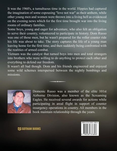 It was the 1960's, a tumultuous time in the world. Hippies had captured the imagination of some espousing "love not war" as their anthem, while other young men and women were thrown into a living hell as evidenced on the evening news which for the first time brought war into the living rooms of ordinary families. Some boys, young and eager for adventure, who also felt an obligation to serve their country, volunteered to participate in history. Dom Russo was one of those men, but he wasn't prepared for the roller coaster ride his life was about to take. The story captures the life of a young man leaving home for the first time, and then suddenly being confronted with the realities of armed combat. Vietnam was the catalyst that turned boys into men and total strangers into brothers who were willing to do anything to protect each other and everything to defend our freedom. It wasn't all bad though. Dom and his friends engineered and enjoyed some wild schemes interspersed between the nightly bombings and missions.