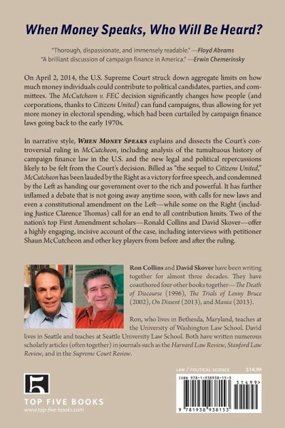 On April 2, 2014, the U.S. Supreme Court struck down aggregate limits on how much money individuals could contribute to political candidates, parties, and committees. The McCutcheon v. FEC decision fundamentally changes how people (and corporations, thanks to Citizens United) can fund campaigns, opening the floodgates for millions of dollars in new spending, which had been curtailed by campaign finance laws going back to the early 1970s. WHEN MONEY SPEAKS is the definitive-and the first-book to explain and dissect the Supreme Court's controversial ruling in McCutcheon, including analysis of the tumultuous history of campaign finance law in the U.S. and the new legal and political repercussions likely to be felt from the Court's decision. McCutcheon has been billed as "the sequel to Citizens United," the decision giving corporations the same rights as individuals to contribute to political campaigns. Lauded by the Right as a victory for free speech, and condemned by the Left as handing the keys of our government over to the rich and powerful, the Court's ruling has inflamed a debate that is not going away anytime soon, with calls for new laws and even a constitutional amendment on the Left-while many on the Right (including Justice Clarence Thomas in his concurring opinion) call for an end to all contribution limits. Two of the nation's top First Amendment scholars-Ronald Collins and David Skover-have produced a highly engaging, incisive account of the case, including exclusive interviews with petitioner Shaun McCutcheon and other key players, as well as an eye-opening history of campaign finance law in the U.S.