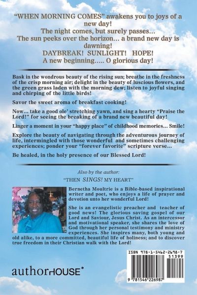 "WHEN MORNING COMES" awakens you to the joys of a new day! The night comes, but soon surely passes... The sun peeks over the horizon... a brand new day is dawning! You can see DAYBREAK! SUNLIGHT! HOPE! A new beginning..... O glorious day! **** Bask in the wondrous beauty of the rising sun; breathe in the freshness of the crisp morning air; delight in the beauty of luscious flowers, and the green grass laden with the morning dew; listen to joyful singing and chirping of the little birds! Savor the sweet aroma of breakfast cooking! Now... take a good ole' stretching yawn, and sing a hearty "Praise the Lord!" for seeing the breaking of a brand new beautiful day! Linger a moment in your "happy place" of childhood memories... Smile! Explore the beauty of navigating through the adventurous journey of life, intermingled with those wonderful and sometimes challenging experiences; ponder your "forever favorite" scripture verse... Be healed, in the holy presence of our Blessed Lord! *** Also by the author: "THEN SINGS! MY HEART"