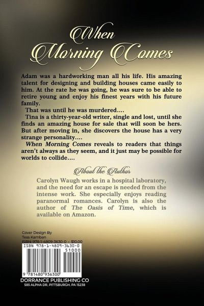 When Morning Comes By: Carolyn Waugh Adam was a hardworking man all his life. His amazing talent for designing and building houses came easily to him. At the rate he was going, he was sure to be able to retire young and enjoy his finest years with his future family. That was until he was murdered…. Tina is a thirty-year-old writer, single and lost, until she finds an amazing house for sale that will soon be hers. But after moving in, she discovers the house has a very strange personality…. When Morning Comes reveals to readers that things aren’t always as they seem, and it just may be possible for worlds to collide…. About the Author Carolyn Waugh works in a hospital laboratory, and the need for an escape is needed from the intense work. She especially enjoys reading paranormal romances. Carolyn is also the author of The Oasis of Time, which is available on Amazon.