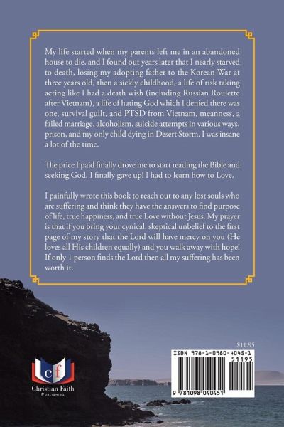 My life started when my parents left me in an abandoned house to die, and I found out years later that I nearly starved to death, losing my adopting father to the Korean War at three years old, then a sickly childhood, a life of risk taking acting like I had a death wish (including Russian Roulette after Vietnam), a life of hating God which I denied there was one, survival guilt, and PTSD from Vietnam, meanness, a failed marriage, alcoholism, suicide attempts in various ways, prison, and my only child dying in Desert Storm. I was insane a lot of the time. The price I paid finally drove me to start reading the Bible and seeking God. I finally gave up! I had to learn how to Love. I painfully wrote this book to reach out to any lost souls who are suffering and think they have the answers to find purpose of life, true happiness, and true Love without Jesus. My prayer is that if you bring your cynical, skeptical unbelief to the first page of my story that the Lord will have mercy on you (He loves all His children equally) and you walk away with hope! If only 1 person finds the Lord then all my suffering has been worth it.