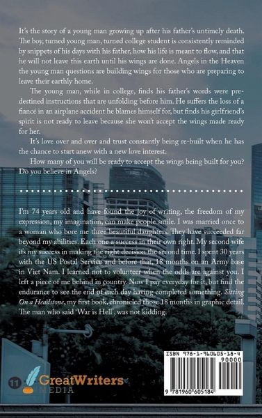 It's the story of a young man growing up after his father's untimely death. The boy, turned young man, turned college student is consistently reminded by snippets of his days with his father, how his life is meant to flow, and that he will not leave this earth until his wings are done. Angels in the Heaven the young man questions are building wings for those who are preparing to leave their earthly home. The young man, while in college, finds his father's words were predestined instructions that are unfolding before him. He suffers the loss of a fiancé in an airplane accident he blames himself for, but finds his girlfriend's spirit is not ready to leave because she won't accept the wings made ready for her. It's love over and over and trust constantly being re-built when he has the chance to start anew with a new love interest. How many of you will be ready to accept the wings being built for you? Do you believe in Angels?