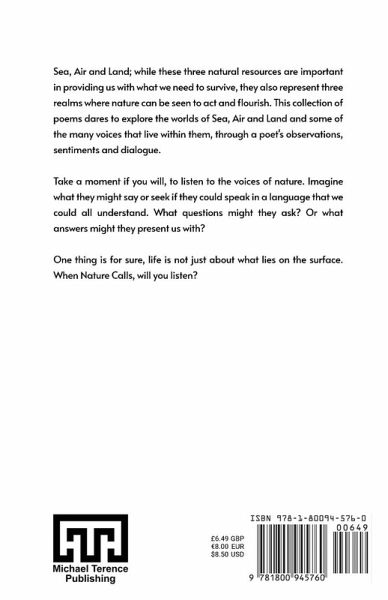 Sea, Air and Land; while these three natural resources are important in providing us with what we need to survive, they also represent three realms where nature can be seen to act and flourish. This collection of poems dares to explore the worlds of Sea, Air and Land and some of the many voices that live within them, through a poet's observations, sentiments and dialogue. Take a moment if you will, to listen to the voices of nature. Imagine what they might say or seek if they could speak in a language that we could all understand. What questions might they ask? Or what answers might they present us with? One thing is for sure, life is not just about what lies on the surface. When Nature Calls, will you listen?