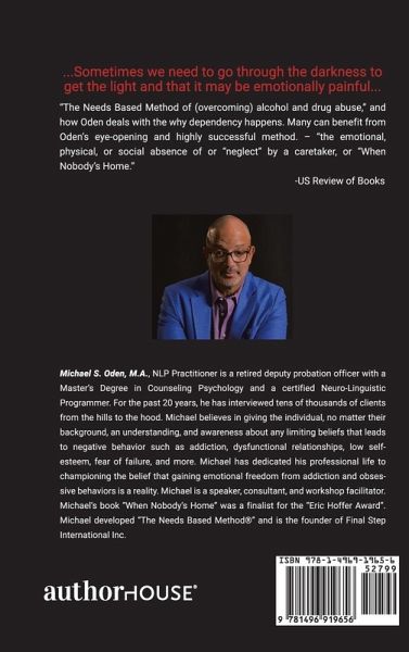 ...sometimes we need to go through the darkness to get to the light and that it may be emotionally painful..." the Needs Based Method of [overcoming] alcohol and drug abuse," and how Oden deals with the why dependency happens. Many can benefit from Oden's eye-opening and highly successful method. -"the emotional, physical, or social absence of or 'neglect' by a caretaker, or when nobody's home." -US Review of Books