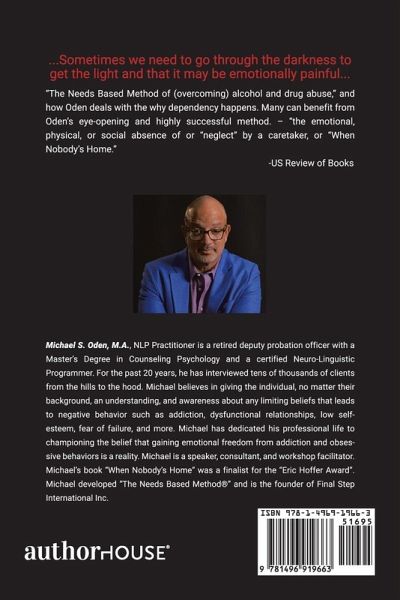 ...sometimes we need to go through the darkness to get to the light and that it may be emotionally painful..." the Needs Based Method of [overcoming] alcohol and drug abuse," and how Oden deals with the why dependency happens. Many can benefit from Oden's eye-opening and highly successful method. -"the emotional, physical, or social absence of or 'neglect' by a caretaker, or when nobody's home." -US Review of Books