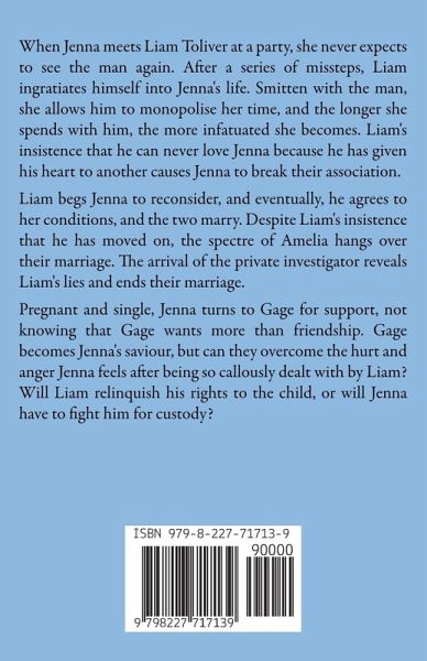 When Jenna meets Liam Toliver at a party, she never expects to see the man again. After a series of missteps, Liam ingratiates himself into Jenna's life. Smitten with the man, she allows him to monopolise her time, and the longer she spends with him, the more infatuated she becomes. Liam's insistence that he can never love Jenna because he has given his heart to another causes Jenna to break their association. Liam begs Jenna to reconsider, and eventually, he agrees to her conditions, and the two marry. Despite Liam's insistence that he has moved on, the spectre of Amelia hangs over their marriage. The arrival of the private investigator reveals Liam's lies and ends their marriage. Pregnant and single, Jenna turns to Gage for support, not knowing that Gage wants more than friendship. Gage becomes Jenna's saviour, but can they overcome the hurt and anger Jenna feels after being so callously dealt with by Liam? Will Liam relinquish his rights to the child, or will Jenna have to fight him for custody?