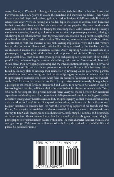 Avery Moore, a 17-year-old photography enthusiast, feels invisible in her small town of Havenwood, Ohio. She yearns to escape the mundane and showcase her talent. Then, Caleb Hayes, a guarded 18-year-old, arrives, igniting a spark of intrigue. Caleb's melancholic eyes and artistic aura draw Avery in, hinting at a hidden depth she craves to explore. Both burdened by their pasts, their flaws are visible, their needs and desires palpable. The reader understands Avery's discontent with her life, her longing for something more. Caleb's arrival disrupts Avery's monotonous routine, fostering a blossoming connection. A photography contest, offering a scholarship to art school, throws them together, their collaboration on a project strengthening their bond, revealing a shared artistic vision. This venture, however, exposes Caleb to danger, a confrontation with the menaces of his past. Seeking inspiration, Avery and Caleb venture beyond the borders of Havenwood, their familiar life symbolized by the familiar town. In an abandoned manor, their connection deepens, Avery capturing Caleb's vulnerability in a photograph, recognizing his hidden talent and the potential within him. They share secrets and vulnerabilities, their bond strengthening with each passing day. Avery learns about Caleb's painful past, understanding the reasons behind his guarded nature. Moved to help him heal, she embraces their developing relationship and the intense emotions it brings. Their new world is a landscape of discovery, a vibrant panorama of emotions. But not all is harmony. Ethan, fueled by jealousy, plots to sabotage their connection by revealing Caleb's past. Avery's parents, worried about her future, are against their relationship, urging her to focus on her studies. As the photography contest looms closer, Avery faces the pressure of competition and her own self-doubt. The characters face numerous conflicts. Avery receives an offer to study photography at a prestigious art school far from Havenwood and Caleb. Torn between her ambition and her burgeoning love for him, a difficult choice beckons: follow her dreams or remain with Caleb, who needs her support. This pivotal moment forces Avery to choose between her individual aspirations and the deep need for connection. Caleb's past overwhelms him, leading to a sudden departure, leaving Avery heartbroken and lost. The photography contest ends in defeat, casting a dark shadow on Avery's future. She questions her talent, her future, and her ability to love. Despair threatens to consume her. Yet, with the unwavering support of her friends and Mrs. Davies, Avery regains her confidence and resolves to fight for what she wants. She embarks on a journey to find Caleb, locating him in his hometown, confronting his demons, and, ultimately, declaring her love. She encourages him to face his past and embrace a brighter future, using her photographs to reveal the hidden beauty within him. The main character faces her enemies, and emerges stronger. Caleb returns to Havenwood with Avery, determined to rebuild his life and pursue his passion for music.