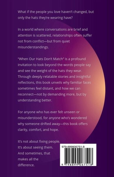 What if the people you love haven't changed-but only the hats they're wearing have? When Our Hats Don't Match is a deeply relatable exploration of modern relationships-why they strain, why familiar faces feel distant, and how misunderstandings often arise not from a lack of love, but from misread signals. Through powerful storytelling and thought-provoking insights, the book introduces the idea that people wear many "hats" in life-roles, responsibilities, burdens unseen. What we often perceive as coldness or change is simply a reflection of the hat they're wearing in that moment. This book is not about fixing others. It's about shifting how we see them. With warmth, empathy, and emotional clarity, When Our Hats Don't Match helps readers reconnect with the people they thought they'd lost-by anchoring to the version of them that mattered most. If you've ever found yourself saying, "They don't feel the same anymore," this book is your invitation to look again-deeper this time.