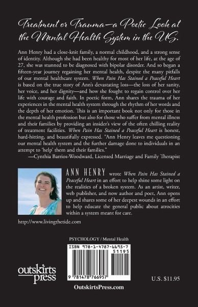 Ann Henry had a close-knit family, a normal childhood, and a strong sense of identity. Although she had been healthy for most of her life, at the age of 27, she was stunned to be diagnosed with bipolar disorder. And so began a fifteen-year journey regaining her mental health, despite the many pitfalls of our mental healthcare system. When Pain Has Stained a Peaceful Heart is based on the true story of Ann's devastating loss-the loss of her sanity, her voice, and her dignity-and how she fought to regain control over her life with courage and faith. In poetic form, Ann shares the trauma of her experiences in the mental health system through the rhythm of her words and the depth of her emotion. This is an important book not only for those in the mental health profession but also for those who suffer from mental illness and their families by providing an insider's view of the often chilling reality of treatment facilities. When Pain Has Stained a Peaceful Heart is honest, hard-hitting, and beautifully expressed. "Ann Henry leaves me questioning our mental health system and the further damage done to individuals in an attempt to 'help' them and their families." -Cynthia Barrios-Woodward, Licensed Marriage and Family Therapist. Ann Henry wrote When Pain Has Stained a Peaceful Heart in an effort to help shine some light on the realities of the mental health system. As an artist, writer, and now author and poet, Ann opens up and shares some of her deepest wounds in an effort to help educate the general public about atrocities within a system meant for care.