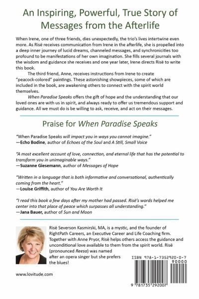 An Inspiring, Powerful True Story of Messages from the Afterlife ¿When Irene, one of three close friends, dies unexpectedly, the trio's lives intertwine in life-changing ways. Immediately following Irene's death, Risë begins to sense her friend's presence around her. While delivering her eulogy from the pulpit at Irene's Celebration of Life, Risë sees Irene sitting in the congregation, her long auburn hair reflecting light from the windows above. Irene is calm and joyful as she glances, smiling, over her family and friends. A fascinating year unfolds as Risë receives continuous communication from Irene from the afterlife through lucid dreams, channeled messages, and synchronicities too profound to be manifestations of her imagination. Under the weekly guidance of a spiritual leadership coach, Risë commits to a disciplined practice of daily meditation, guided imagery, spiritual experiences, and journaling to document all that she is experiencing and to make sense of this new relationship with the afterlife. One year later, Irene directs Risë to write this book from the journals she has filled, telling her that she will be her ghost writer from the other side. The book is to be shared with the world, offering hope and understanding that our loved ones are always with us from beyond the veil to bring comfort and support. Weeks later, the third friend, Anne, receives instructions from Irene to begin creating large, inspiring, "peacock-colored" paintings, using special inks and her breath. Though Anne was not an artist and nor was Irene, the directions are specific that she is to breathe the souls of those who have passed into her paintings using this unusual technique. Within months, Anne has created hundreds of paintings. These astonishing showpieces, some of which are included in the book, are awakening others around the world to connect with the spirit world themselves. When Paradise Speaks is an uplifting and highly engaging story about three friends and what transpired when they were willing to embrace and act on after-death communication. This book validates that our loved ones are with us in spirit, and always ready to offer us their loving guidance. All we must do is be willing to ask, receive, and act on their messages.