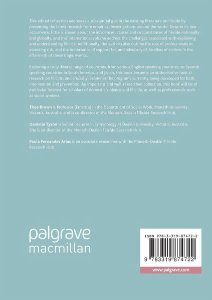 This edited collection addresses a substantial gap in the existing literature on filicide by presenting the latest research from empirical investigations around the world. Despite its low occurrence, little is known about the incidences, causes and circumstances of filicide nationally and globally, and this international volume address the challenges associated with explaining and understanding filicide. Additionally, the authors also outline the role of professionals in assessing risk, and the importance of support for, and advocacy of, families of victims in the aftermath of these tragic events.