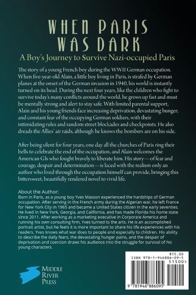 The story of a young French boy during the WWII German occupation. When five-year-old Alain, a little boy living n Paris, is strafed by German planes at the onset of the German invasion in 1940, his world is instantly turned on its head. During the next four years, like the children who fight to survive today's many conflicts around the world, he grows up fast and must be mentally strong and alert to stay safe. With limited parental support, Alain and his young friends face increasing deprivation, devastating hunger and constant fear of the occupying German soldiers, with their intimidating rules and random street blockades and checkpoints. He also dreads the Allies' air raids, although he knows the bombers are on his side. After being silent for four years, one day all the churches of Paris ring their bells to celebrate the end of the occupation, and Alain welcomes the American GIs who fought bravely to liberate him. His story - of fear and courage, despair and determination - is laced with the realism only an author who lived through the occupation himself can provide, bringing this bittersweet, beautifully rendered novel to vivid life.