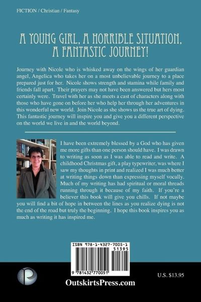 Journey with Nicole who is whisked away on the wings of her guardian angel, Angelica who takes her on a most unbelievable journey to a place prepared just for her. Nicole shows strength and stamina while family and friends fall apart. Their prayers may not have been answered but hers most certainly were. Travel with her as she meets a cast of characters along with those who have gone on before her who help her through her adventures in this wonderful new world. Join Nicole as she shows us the true art of dying. This fantastic journey will inspire you and give you a different perspective on the world we live in and the world beyond.