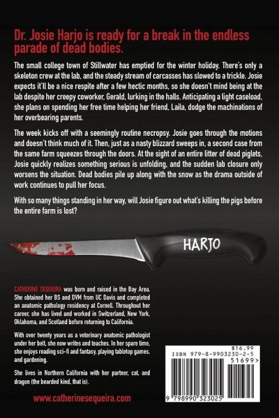 Dr. Josie Harjo is ready for a break in the endless parade of dead bodies. The small college town of Stillwater has emptied for the winter holiday. There's only a skeleton crew at the lab, and the steady stream of carcasses has slowed to a trickle. Josie expects it'll be a nice respite after a few hectic months, so she doesn't mind being at the lab despite her creepy coworker, Gerald, lurking in the halls. Anticipating a light caseload, she plans on spending her free time helping her friend, Laila, dodge the machinations of her overbearing parents. The week kicks off with a seemingly routine necropsy. Josie goes through the motions and doesn't think much of it. Then, just as a nasty blizzard sweeps in, a second case from the same farm squeezes through the doors. At the sight of an entire litter of dead piglets, Josie quickly realizes something serious is unfolding, and the sudden lab closure only worsens the situation. Dead bodies pile up along with the snow as the drama outside of work continues to pull her focus. With so many things standing in her way, will Josie figure out what's killing the pigs before the entire farm is lost?