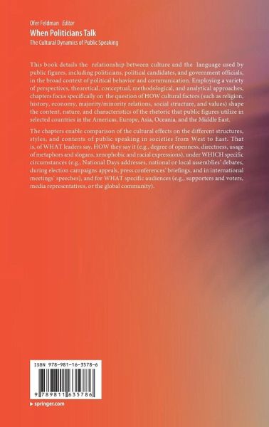 The chapters enable comparison of the cultural effects on the different structures, styles, and contents of public speaking in societies from West to East. That is, of WHAT leaders say, HOW they say it (e.g., degree of openness, directness, usage of metaphors and slogans, xenophobic and racial expressions), under WHICH specific circumstances (e.g., National Days addresses, national or local assemblies' debates, during election campaigns appeals, press conferences' briefings, and in international meetings' speeches), and for WHAT specific audiences (e.g., supporters and voters, media representatives, or the global community).