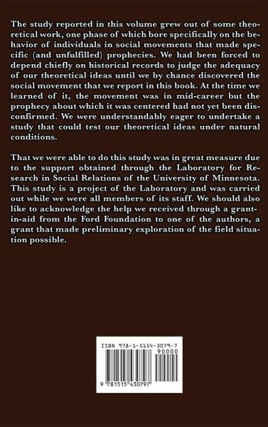 The study reported in this volume grew out of some theoretical work, one phase of which bore specifically on the behavior of individuals in social movements that made specific (and unfulfilled) prophecies. We had been forced to depend chiefly on historical records to judge the adequacy of our theoretical ideas until we by chance discovered the social movement that we report in this book. At the time we learned of it, the movement was in mid-career but the prophecy about which it was centered had not yet been disconfirmed. We were understandably eager to undertake a study that could test our theoretical ideas under natural conditions. That we were able to do this study was in great measure due to the support obtained through the Laboratory for Research in Social Relations of the University of Minnesota. This study is a project of the Laboratory and was carried out while we were all members of its staff. We should also like to acknowledge the help we received through a grant-in-aid from the Ford Foundation to one of the authors, a grant that made preliminary exploration of the field situation possible.